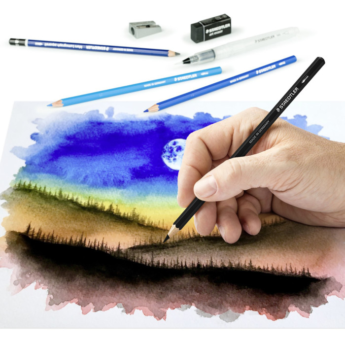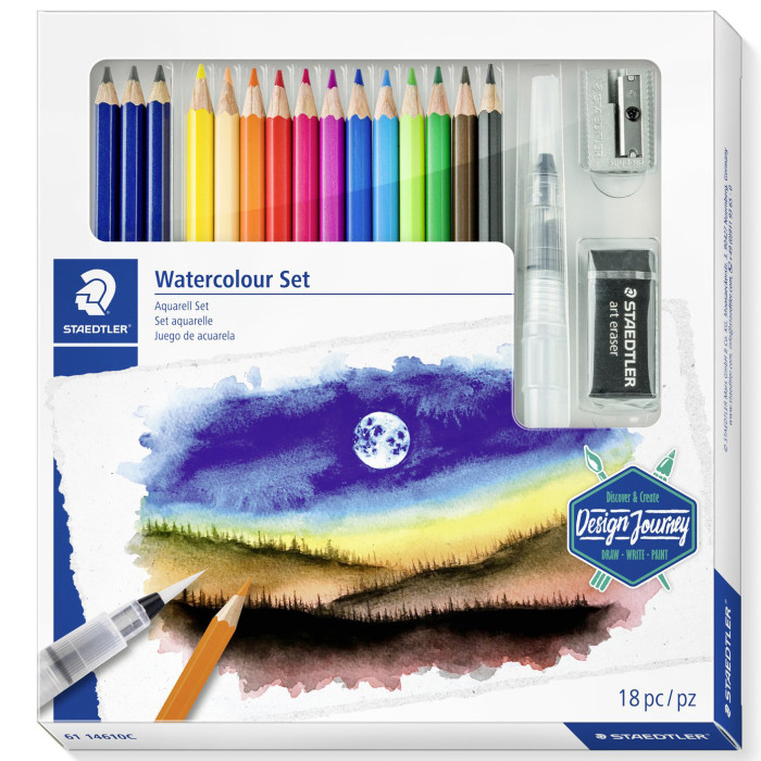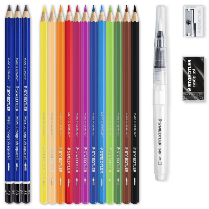 Disegna e colora con il kit di pastelli acquerellabili della Staedtler! Le dodici matite colorate sono di alta qualità e hanno una mina morbida per sorprendenti effetti luminosi su carta per acquerello. Le matite sono in legno certificato PEFC, proveniente da foreste a gestione sostenibile. Il set contiene: tre matite in grafite acquerellabile in gradazioni assortite Lumograph aquarell (4B, 6B, 8B); dodici matite acquerellabili in colori assortiti (giallo, rosa chiaro, arancione, rosso, fucsia, magenta, blu, celeste, verde, verde chiaro, marrone e nero); pennello ad acqua; gomma rasoplast nera; temperamatite in metallo con un foro.